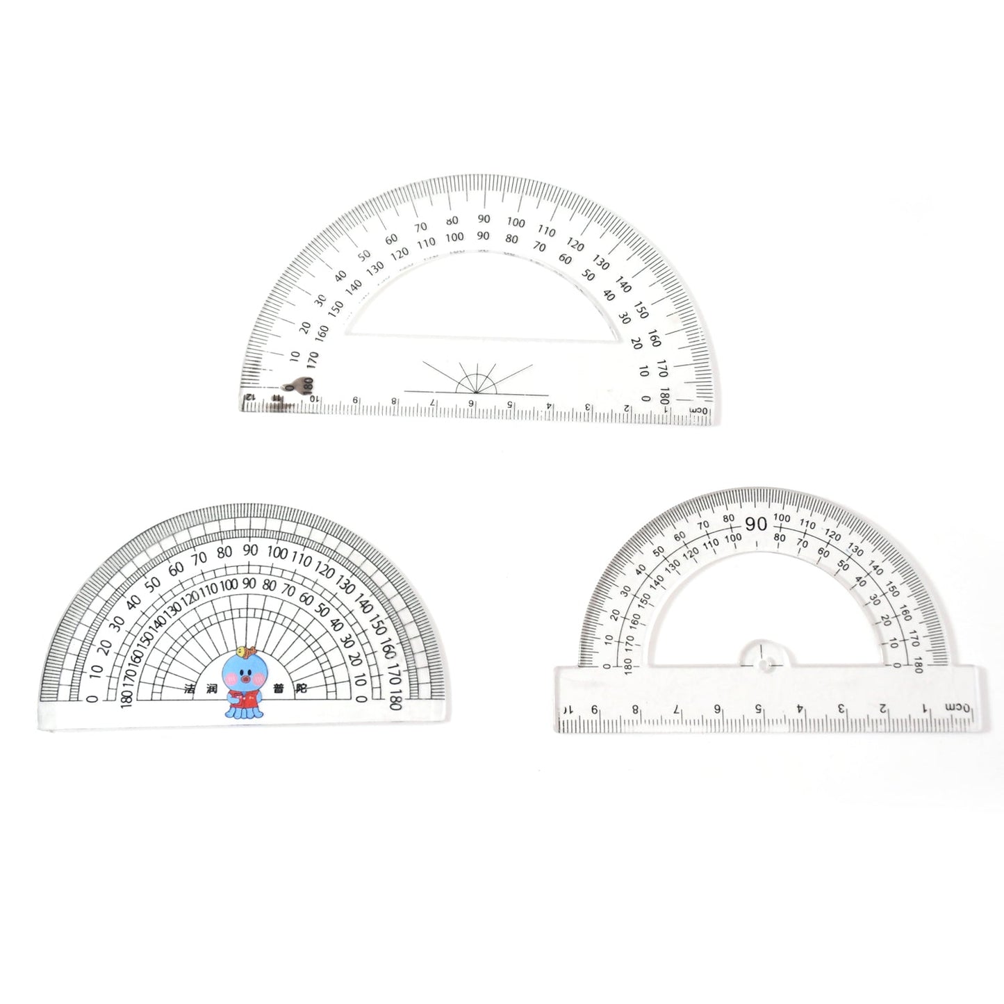 Multipurpose Transparent Plastic Protractor Set – 180-Degree Geometry Measurement Tool for School, Office & Drawing Use – Assorted Designs with Scale Markings (3 Pcs Set)